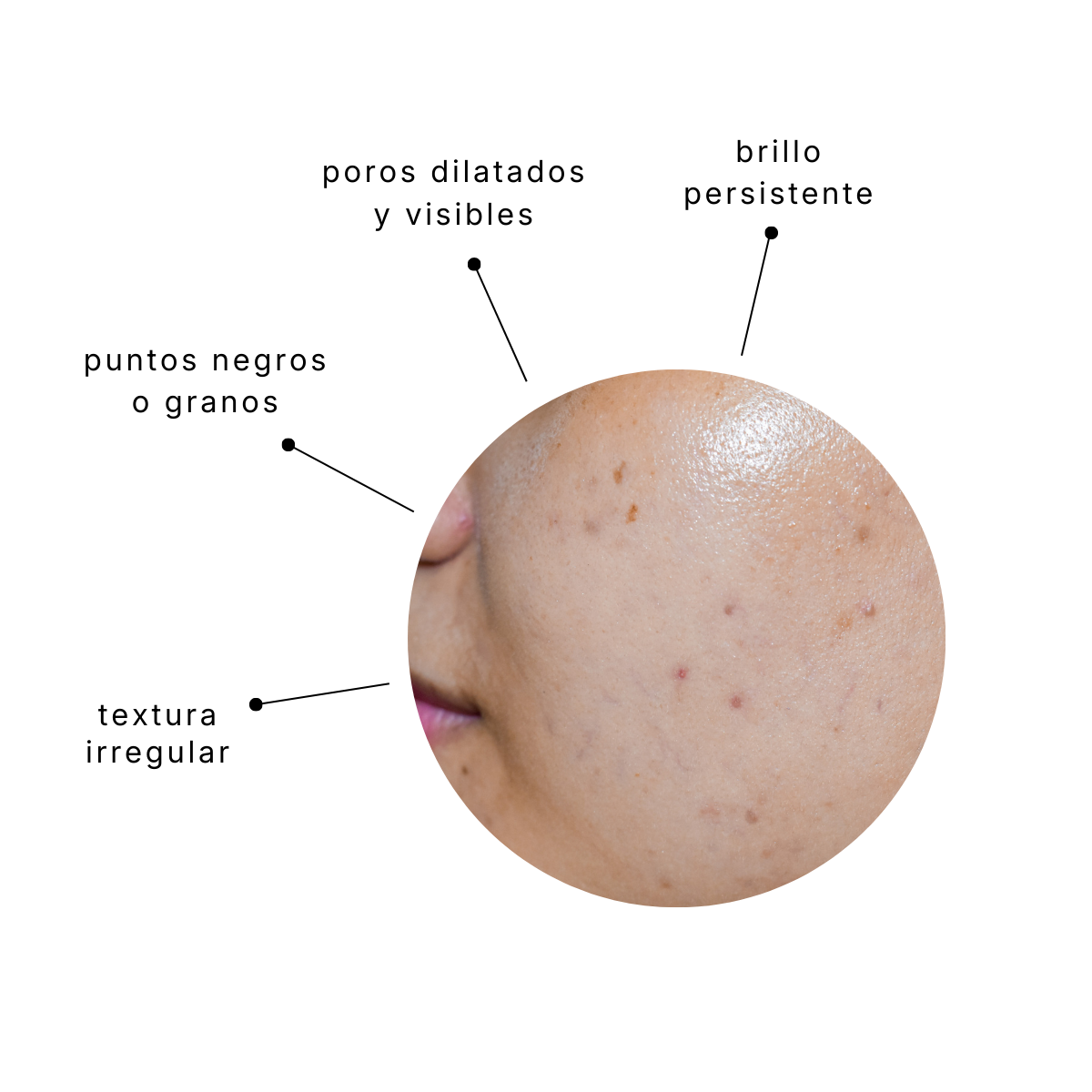 - Brillo persistente: especialmente en la zona T (frente, nariz y mentón).